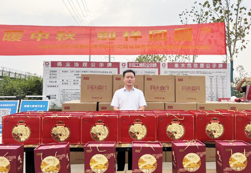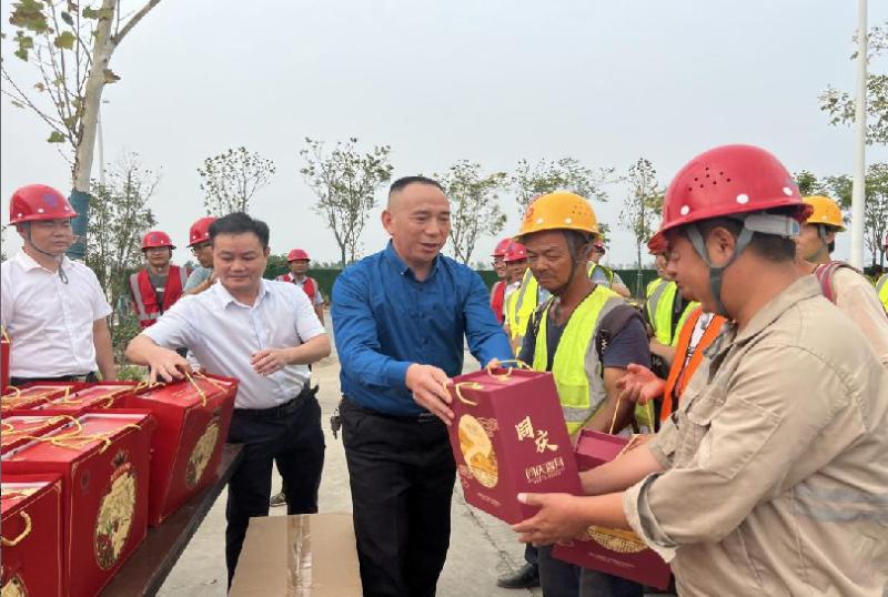 共享中秋月,盛世好佳節(jié)。9月9日下午,在中秋佳節(jié)來(lái)臨之際,合肥院公共事業(yè)部部長(zhǎng)楊如順與公司總經(jīng)理計(jì)康生一行來(lái)到院高端裝備智造園項(xiàng)目,向節(jié)日期間堅(jiān)守崗位的400多名勞動(dòng)者送上了月餅、水果等慰問(wèn)品,并向他們致以了親切的問(wèn)候和誠(chéng)摯的祝福。